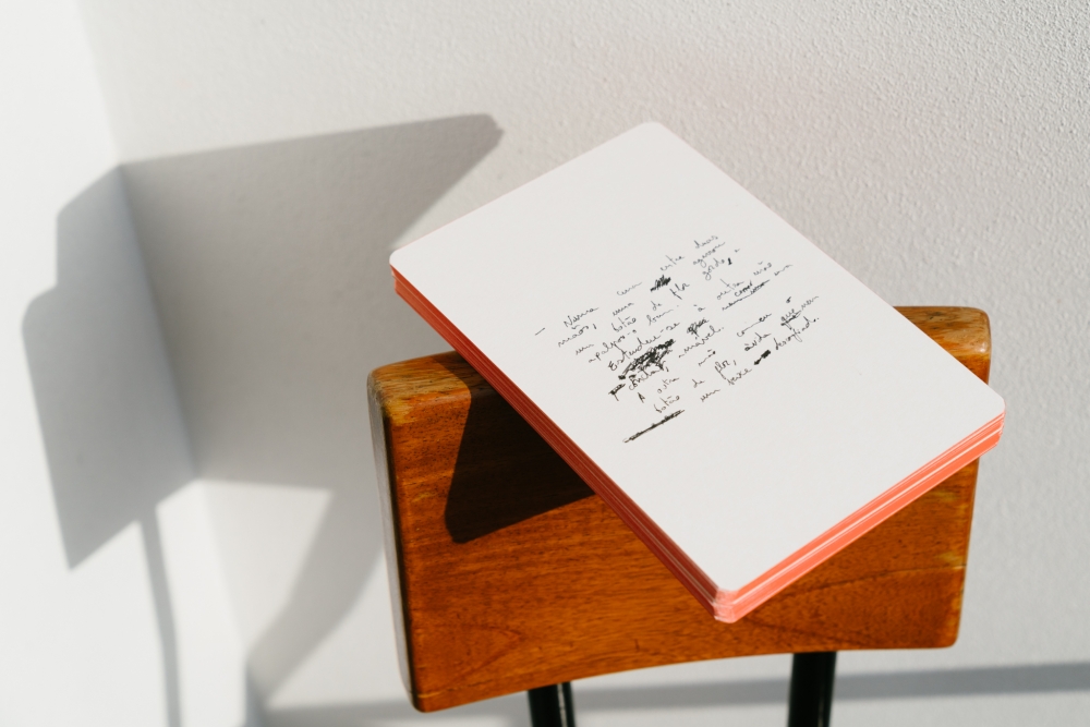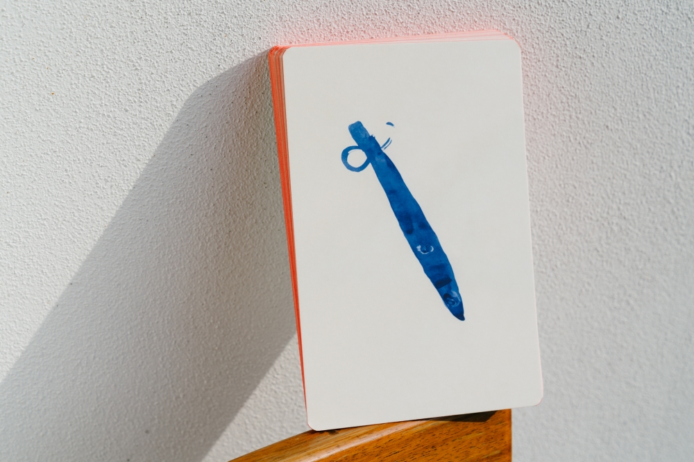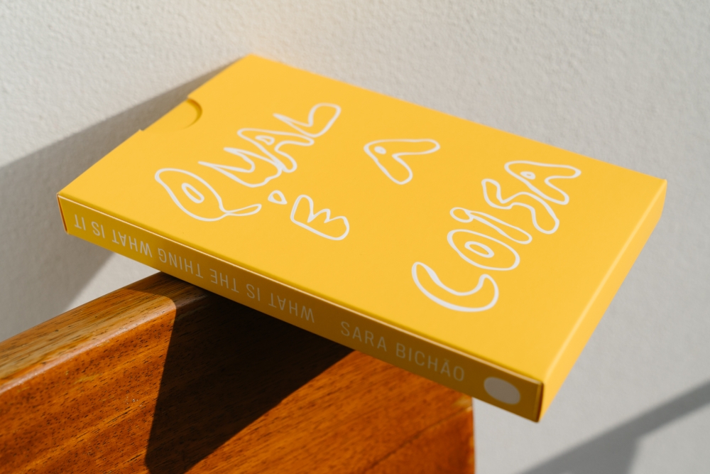 Qual é a coisa, qual é ela é uma edição que foi pensada após a visita de Dayana Lucas à exposição - com o mesmo título - de Sara Bichão, na Galeria Filomena Soares em Lisboa (2020). Era um espaço que marcava tensões sob o espectro de uma resposta. Ou, sobre a sombra de uma pergunta. Agora, a Orinoco propõe um baralho de 27 cartas, sem ordem. Duas faces para cada carta: de um lado, apresentam-se os 27 desenhos que fizeram parte desta exposição; do outro, revelam-se frases escritas nos últimos cadernos diários de SB (à data de 2020). Esta proposta é um bloco que se desenrola manualmente, no mesmo sentido rotativo das adivinhas. Qual é a coisa, qual é ela desafia o que há de mais bonito numa colaboração: a confiança, a corrente da subjetividade poética e o prazer de jogar em conjunto. Entre as artes visuais e o design gráfico; o desenho e o escrever manuscrito; a matéria e a cor.